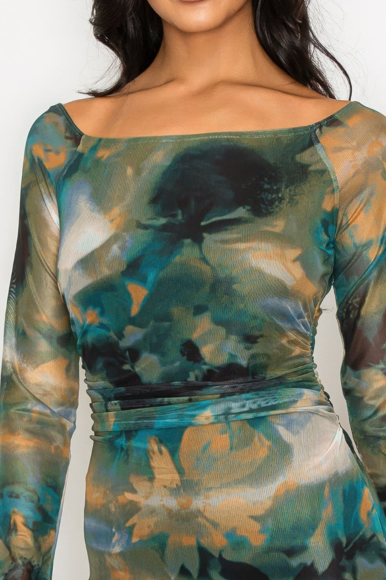 Dare to mesmerize with our Slit Off-Shoulder Mesh Printed Dress. Add it to your cart now and experience the perfect blend of drama and elegance!