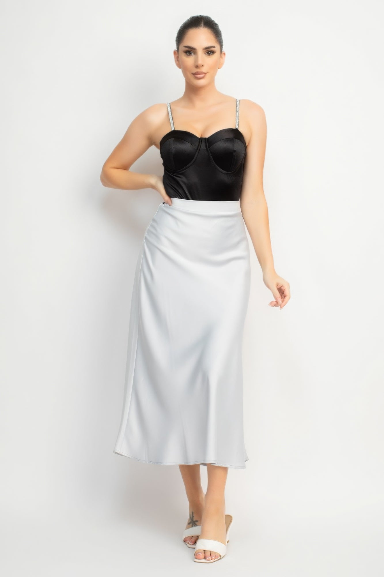 Crafted from a luxurious blend of 95% polyester and 5% spandex, this bodysuit offers both comfort and stretch. The sweetheart neckline and adjustable cami straps adorned with rhinestones add a touch of glamour to the fitted silhouette.