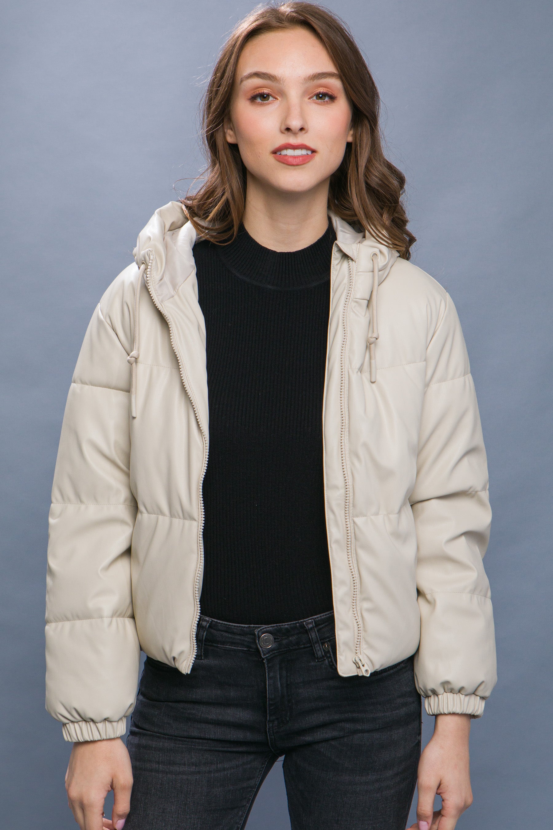 Why Choose the PU Faux Leather Zipper Hooded Puffer Jacket in Azure?