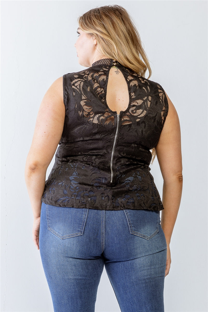 Add the Plus Lace Mesh Ruffle Detail Sleeveless Flare Hem Top to your cart now and experience the perfect blend of fashion and allure!